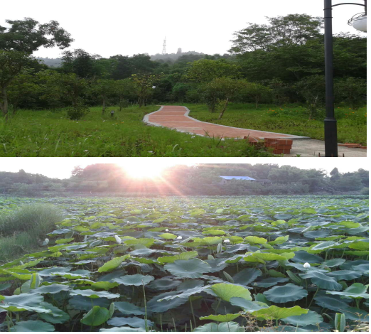 满沟流香满沟绿,叶撑玉伞花含羞。夕照荷塘风送爽,漫步画间无倦容。