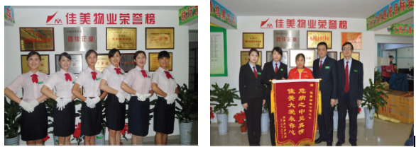 多年来,佳美人的优质服务受到了社会各界和广大业主的广泛好评。佳美公司是资阳地区唯一获得四川省人民政府和四川省质量技术监督局授予的“四川服务名牌”、“四川省服务标准化单位”,多个项目获省级“优秀大厦”、“优秀住宅小区”。佳美党支部被中共资阳市委、资阳市人民政府授予“全市先进基层党组织”、“优秀民营企业”、“文明单位”;被资阳市司法部门评为“依法治企示范单位”。同时,公司总经理当选为资阳市政协委员,被中共资阳市委评为“优秀共产党员”;企业一名保洁工荣获“全国五一劳动奖章”,一名项目经理当选为资阳市人大代表。佳美公司全面持续推进:执行制度军队化,培养人才学校化,员工团结家庭化,实现梦想事业化的“四化”建设。让每位员工都有信仰;让每位佳美人都有幸福感、归宿感,认同佳美物业是最好的发展平台;在佳美强大的企业文化引领下,佳美人都能按照佳美人的做人原则:老老实实做人,踏踏实实做事,为广大业主服好务!