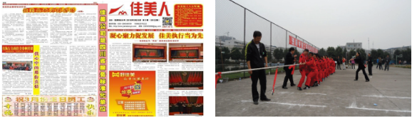佳美公司还编制了企业团队队歌,公司所有的大、小会议均要高唱公司团队队歌。员工们在歌声中坚定了自己的信仰和价值观。佳美公司举办了多工种的专业技能比赛和职工运动会,多次参加市委、市政府组织的各项活动并取得好的成绩。佳美公司每年都与社区广大业主举行大型迎新春文艺晚会。到目前为止,已连续12 年成功举办12 届大型迎新春文艺晚会。同时,佳美公司多年来都为众多小区的广大业主举办了“庆六一儿童画展”、“庆国庆中秋趣味活动”等不同形式的活动,受到了广大业主的好评。佳美公司让企业学校化使企业成为教导型的组织,培养了大量的教导型人才。佳美公司创办了《佳美人》报,开辟专版面向广大业主和全体员工传递党和国家信息、进行法制宣传、赞美和谐家庭、宣扬社会正能量、表彰先进员工事迹、员工故事等。《佳美人》报成为与社会各界、广大业主和员工们沟通的桥梁。