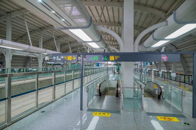 福田站为地上三层双岛式高架站,1层为站厅层,2层为TOD连廊层,3层为站台层。外立面整体设计为前卫的航空器造型,辅以极具速度感的条窗,呈现一幅翱翔腾飞的姿态,寓意对空港新区繁荣发展的美好愿景。