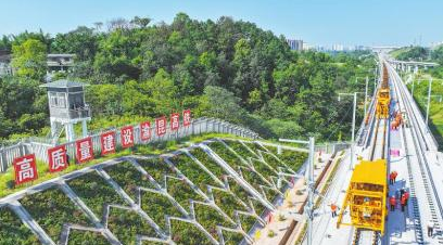 9月6日上午,在泸州市冯湾特大桥施工现场,随着第一组500米长的钢轨稳稳落下,重庆至昆明高速铁路重庆至宜宾段(简称“渝昆高铁川渝段”)全面进入铺轨阶段。