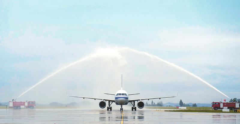 9月12日,来自中国国际航空公司的空客A319飞机在阆中古城机场通过“水门”。