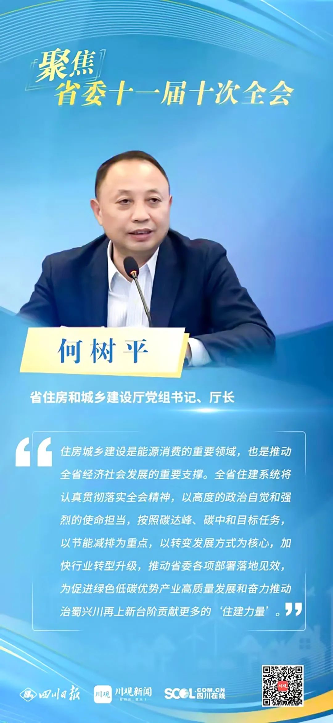 住房城乡建设是能源消费的重要领域,也是推动全省经济社会发展的重要支撑。全省住建系统将认真贯彻落实全会精神,以高度的政治自觉和强烈的使命担当,按照碳达峰、碳中和目标任务,以节能减排为重点,以转变发展方式为核心,加快行业转型升级,推动省委各项部署落地见效,为促进绿色低碳优势产业高质量发展和奋力推动治蜀兴川再上新台阶贡献更多的“住建力量”。