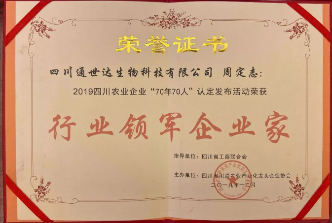 12月22日下午,由四川省工商业联合会指导,四川省农业企业协会主办,国务院国资委主管的《消费日报》协办的主题为“壮丽70年,奋斗新时代”、“70年70人”四川农业企业优秀企业家发布会,在成都市高新区通威国际中心隆重举行。四川通世达生物科技有限公司董事长周定志先生荣获“行业领军企业家”荣誉称号。