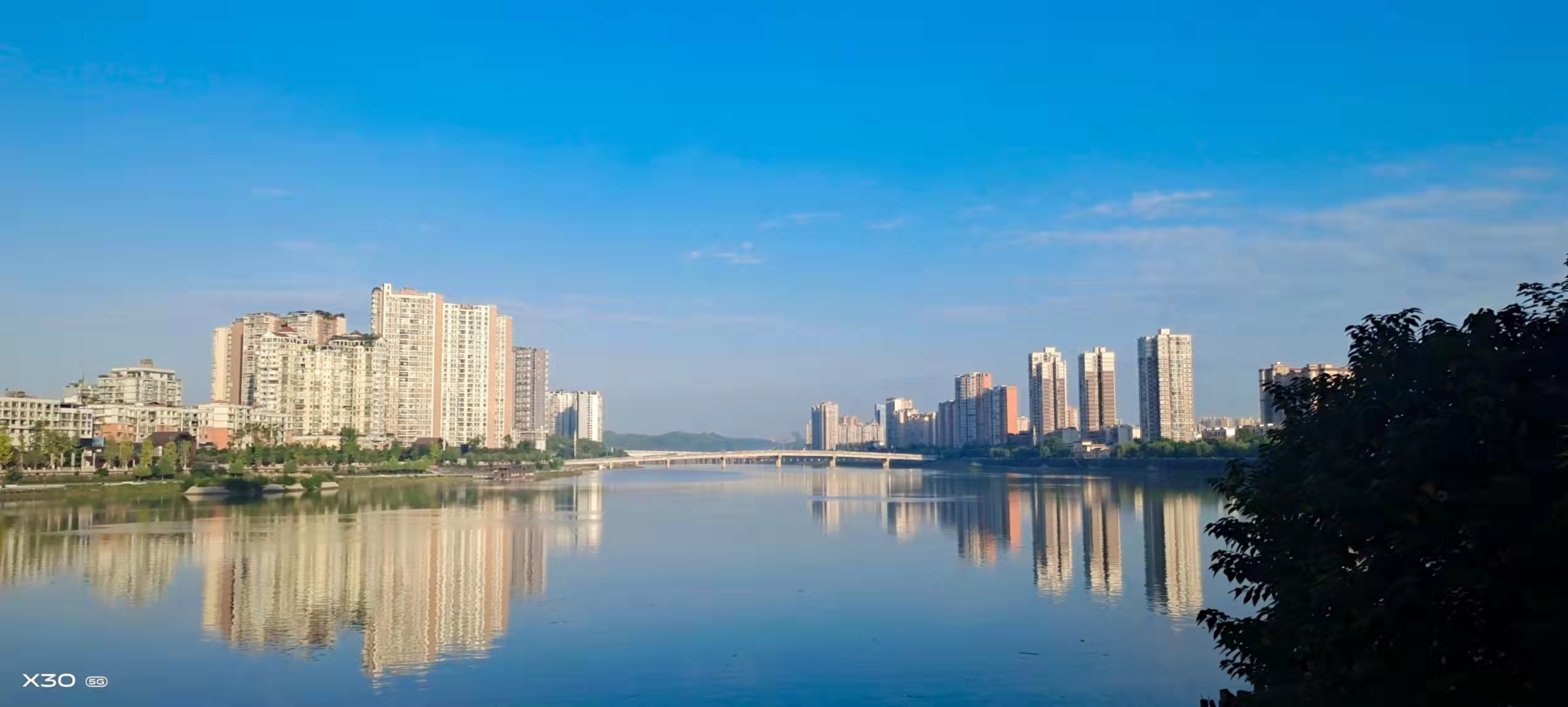 一抹朝阳洒金辉,岸边垂柳微风柔。半江秋波半江情,一衣带水思乡愁。玉兔嫦娥传佳话,举杯对月赏中秋。城山相映共朝晖,人水共生竞风流。