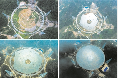 这张拼版照片为FAST项目拼装第一块反射面板(左上,2015年8月2日摄)、FAST反射面板安装近半(右上,2015年12月16日摄)、FAST项目反射面板安装近八成(左下,2016年3月9日摄)、FAST项目反射面板安装完成(右下,2016年7月3日摄)。