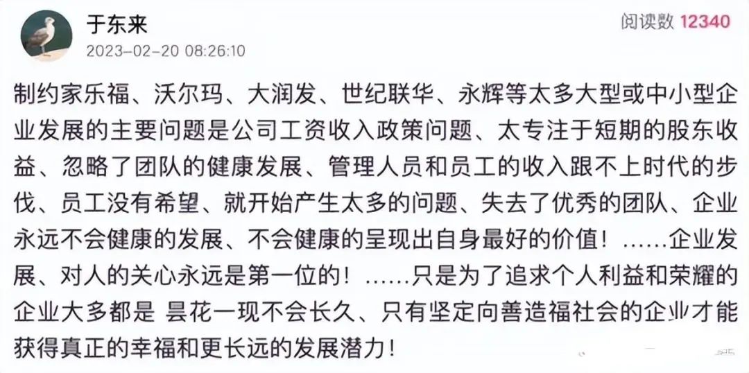不要老是吹自己捐了多少钱,你要是真的想做慈善的话,你不要去做慈善,你就先把自己的员工待遇提升起来就可以了。