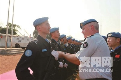日前,从西非利比里亚传来喜讯——联合国驻利比里亚特派团授予中国第五支驻利比里亚维和警察防暴队联合国和平勋章,以表彰他们在维和任务中作出的突出贡献。防暴队执勤官、乐至籍小伙彭思杰由联合国秘书长特别代表法里德·扎里夫授予联合国和平勋章。