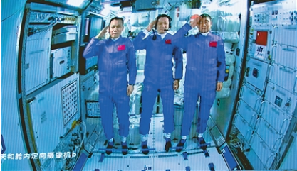 6月17日在北京航天飞行控制中心拍摄的进驻天和核心舱的航天员向全国人民敬礼致意的画面。